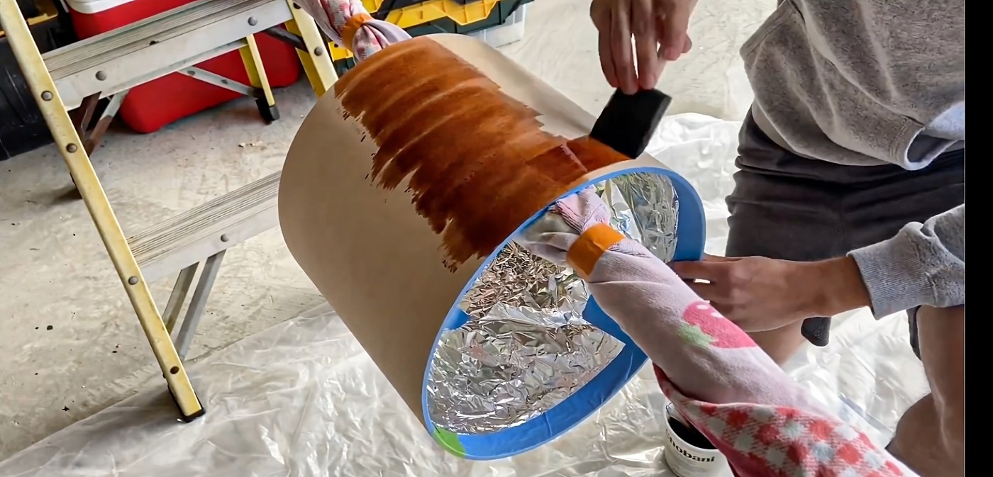 Before applying the stain, I highly recommend covering the inside of the shell with foil to prevent any seepage. Then, I typically brush the stain over the entire drum shell and let it sit for 5-10 minutes to allow it to soak in. Afterward, I wipe the shell with a clean rag to remove any excess stain that hasn’t soaked in. If the color appears too light, you can always apply another coat.